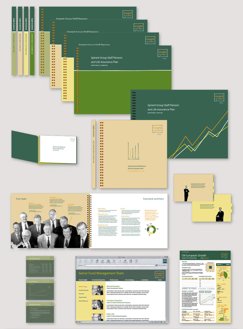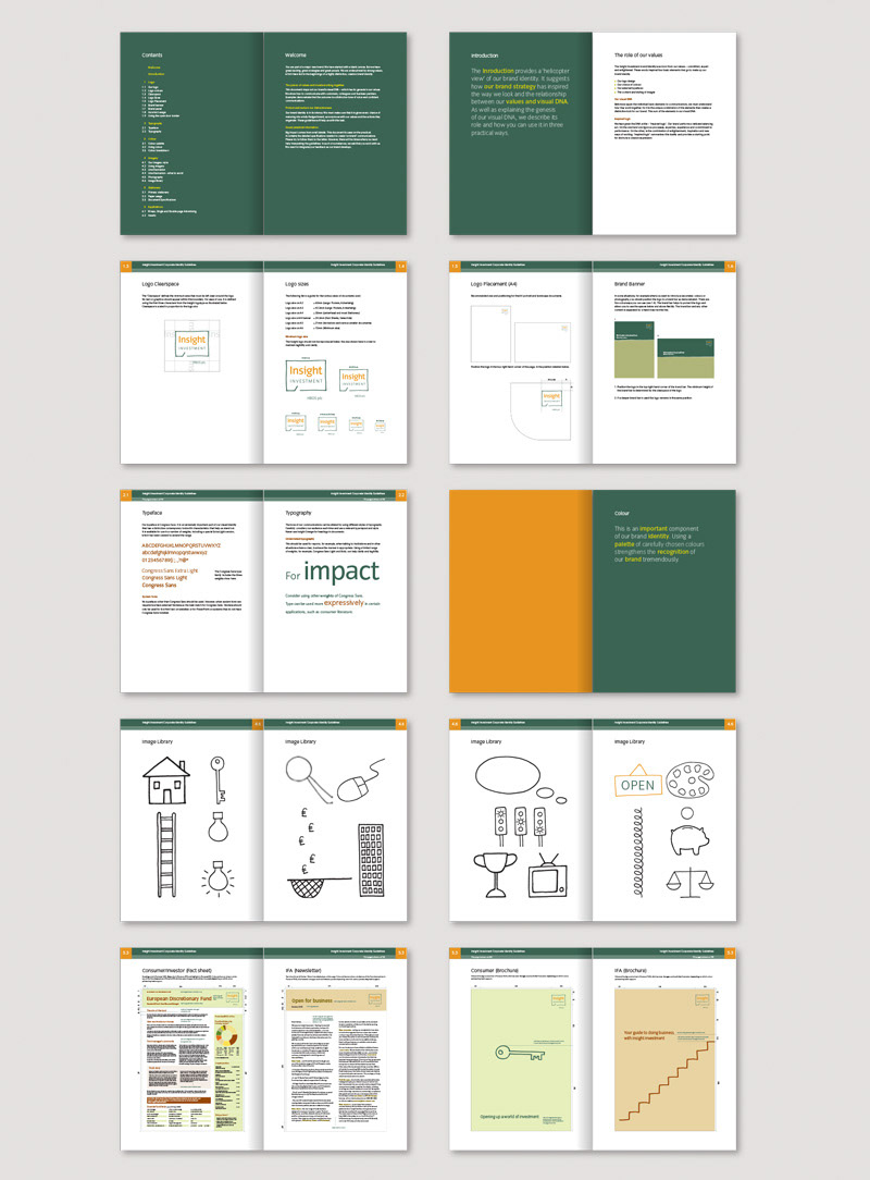 Working as a senior designer as part of the brand launch team of Insight Investment, the asset management arm of Halifax Bank of Scotland. Over the course of a year we developed a comprehensive brand guidelines with over 300 items and templates